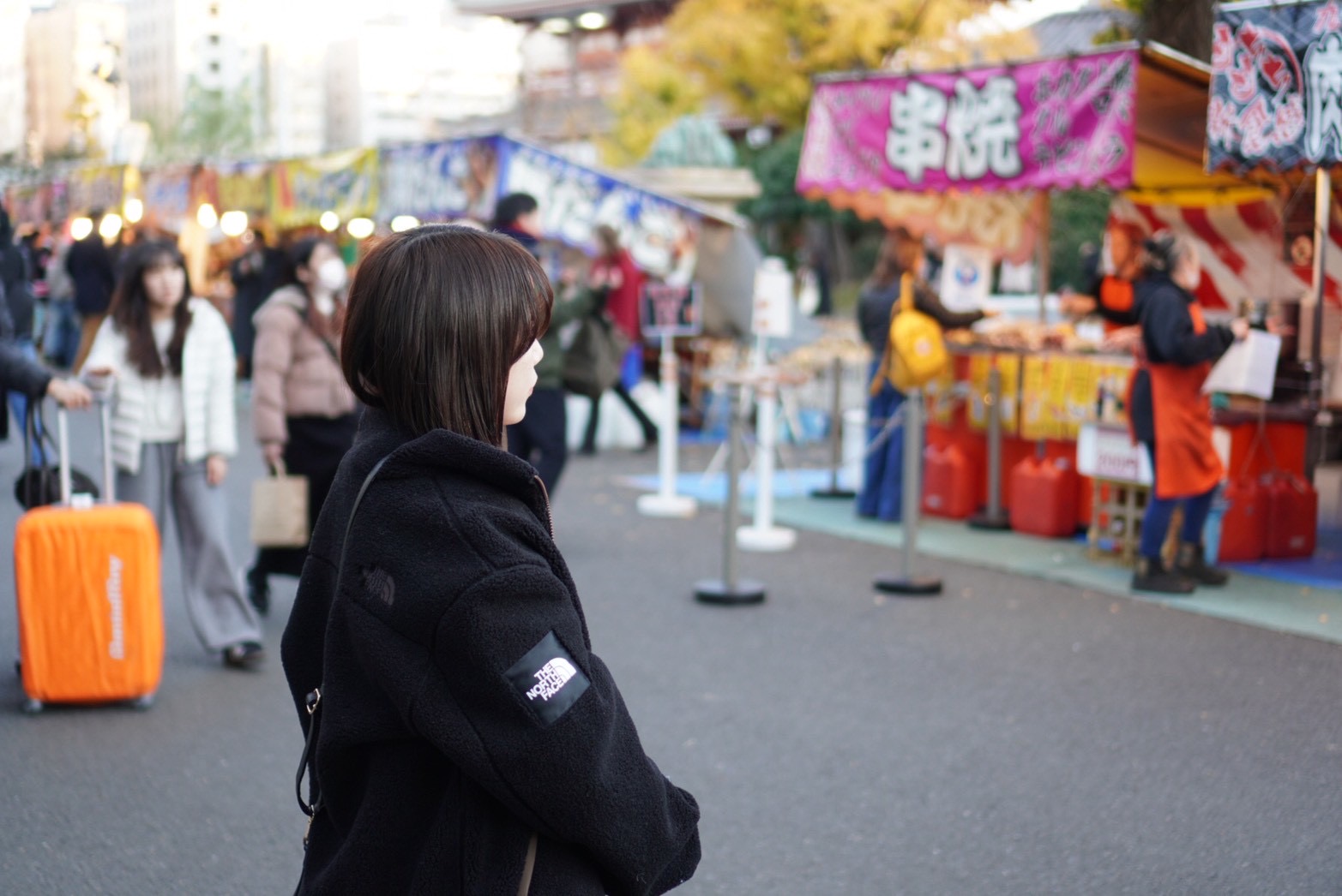 仲見世通りを歩くと、昔ながらのお店や人の賑わいが心地よく、つい立ち止まってお団子や和雑貨を眺めてしまいます。浅草寺の周辺は観光客で賑わっていましたが、落ち着いた冬の空気と相まって、穏やかな時間です。